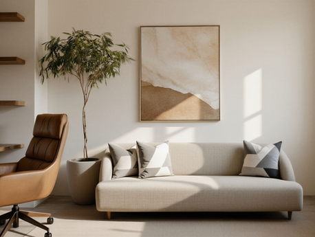 The design aims to create a neutral, warm, and welcoming environment that supports comfort, openness, and emotional ease for both therapist and clients. A soft, grounded palette, tactile natural textures, and gentle patterns will replace the current cold lighting and sterile white walls to bring warmth and connection.